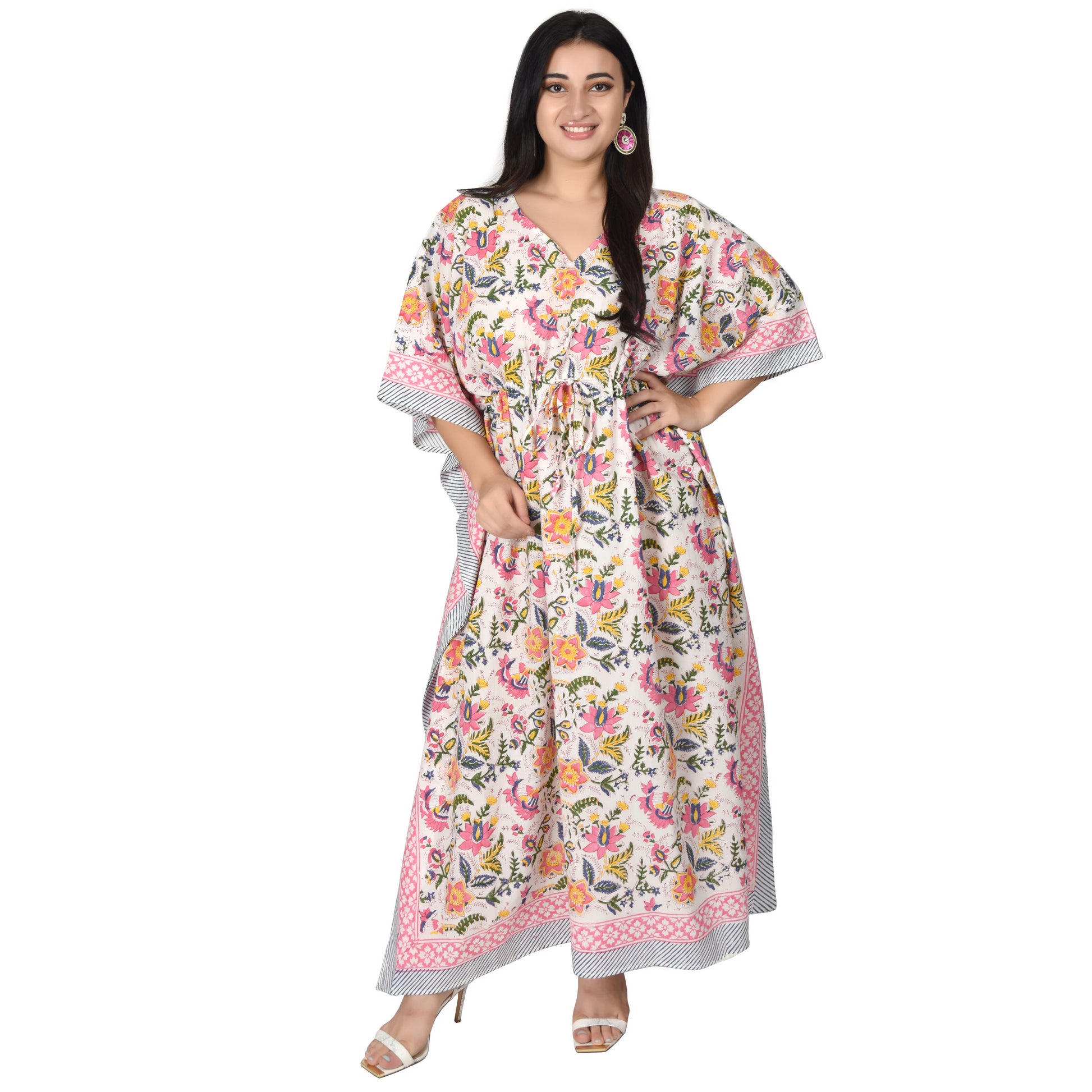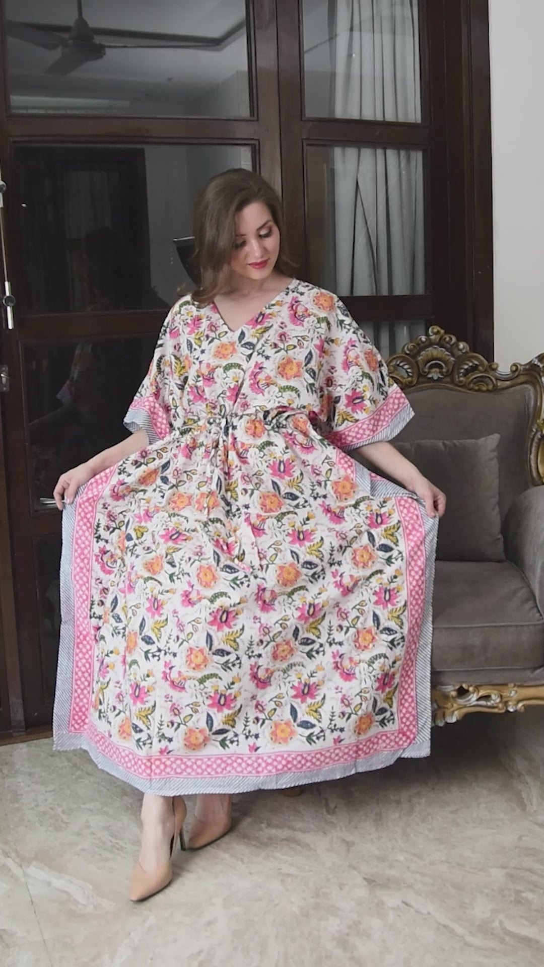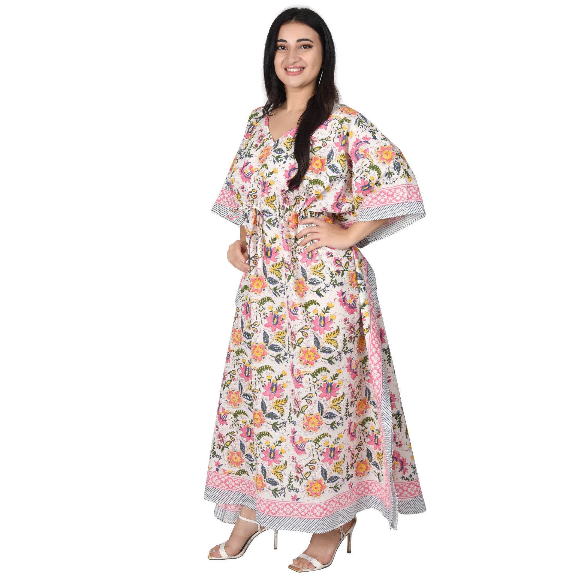 These colorful cotton caftans for women are perfect for warm weather wear. Block printed by hand with vibrant floral motifs, each caftan has a unique aesthetic. Made of breathable cotton fabric, these caftans will keep you cool in the summer heat. The loose silhouette provides an airy and comfortable fit, with three-quarter sleeves allowing free arm movement. Whether you're lounging at home or heading to the beach, these caftans make for effortless style. Machine washable for easy care, they can be paired with sandals or worn as cover-ups over swimsuits. Add a pop of print to your wardrobe with one of these beautiful block printed caftans.