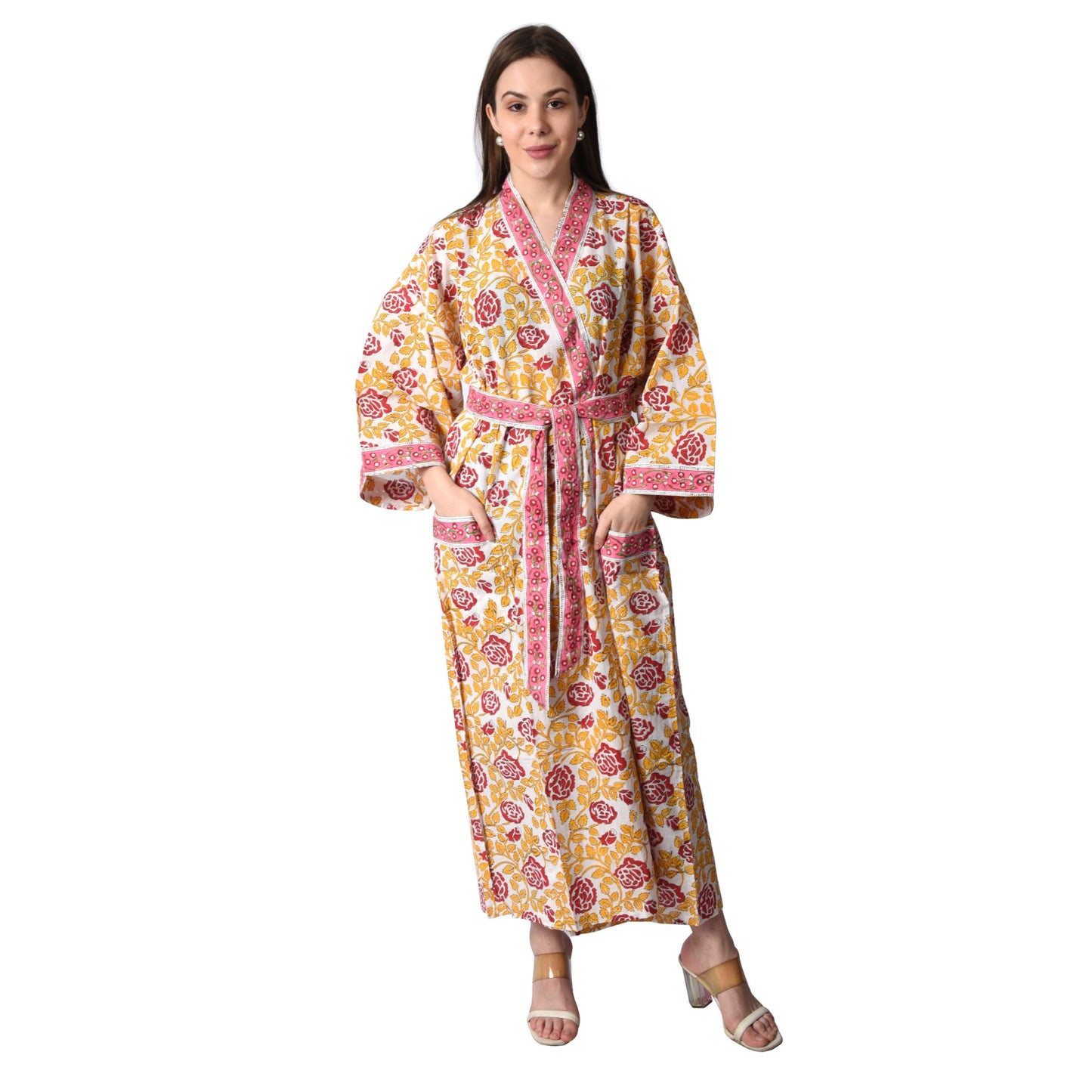 This Hand Block Printed Gorgeous Long Kimono robe is made from lightweight Pure cotton Fabric. It has 2 pockets with a matching belt. This Kimono is long length with full length sleeve. This is Hand Block Printed Kimono and its traditional art of Jaipur. Available in One Free Size length is Approx 53 inches