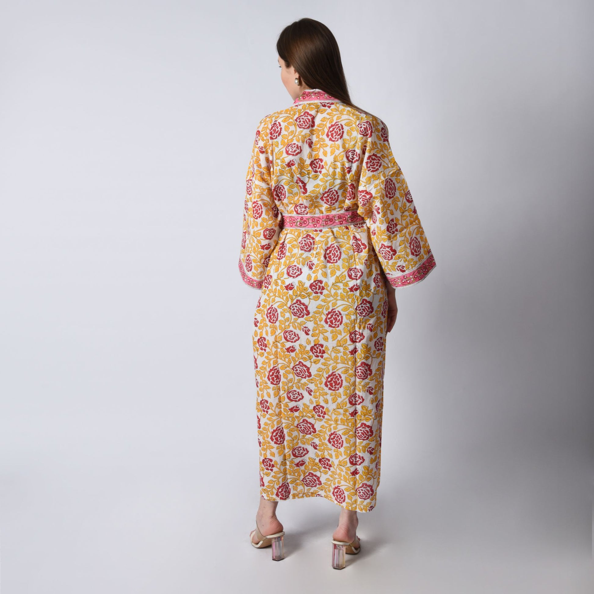 Hand Block Printed Sanganeri Jaipuri Floral Women Casual Kimono Dress Beach wear sleepwear belted dress