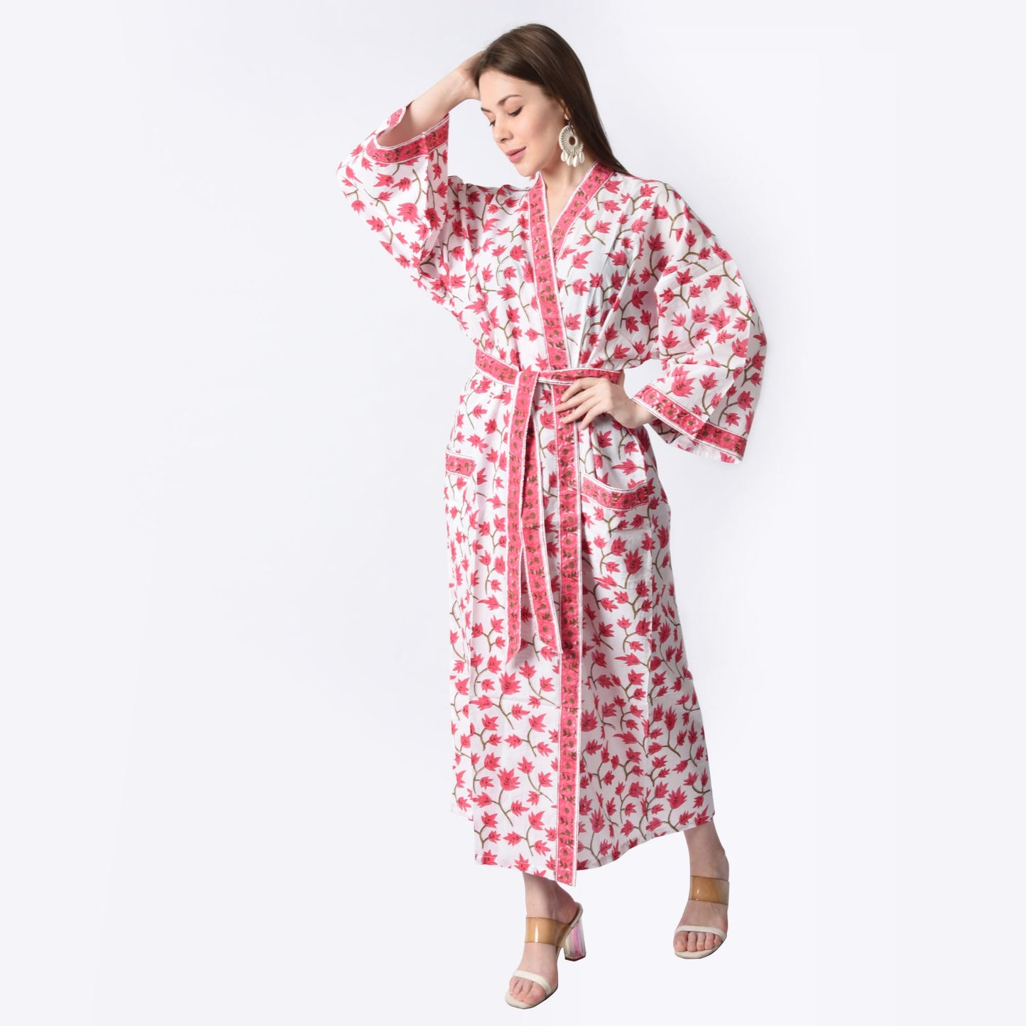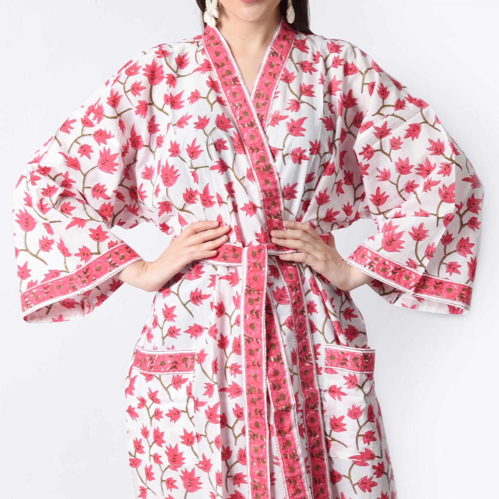 Hand Block Printed Sanganeri Jaipuri Floral Women Casual Kimono Dress Beach wear sleepwear belted dress