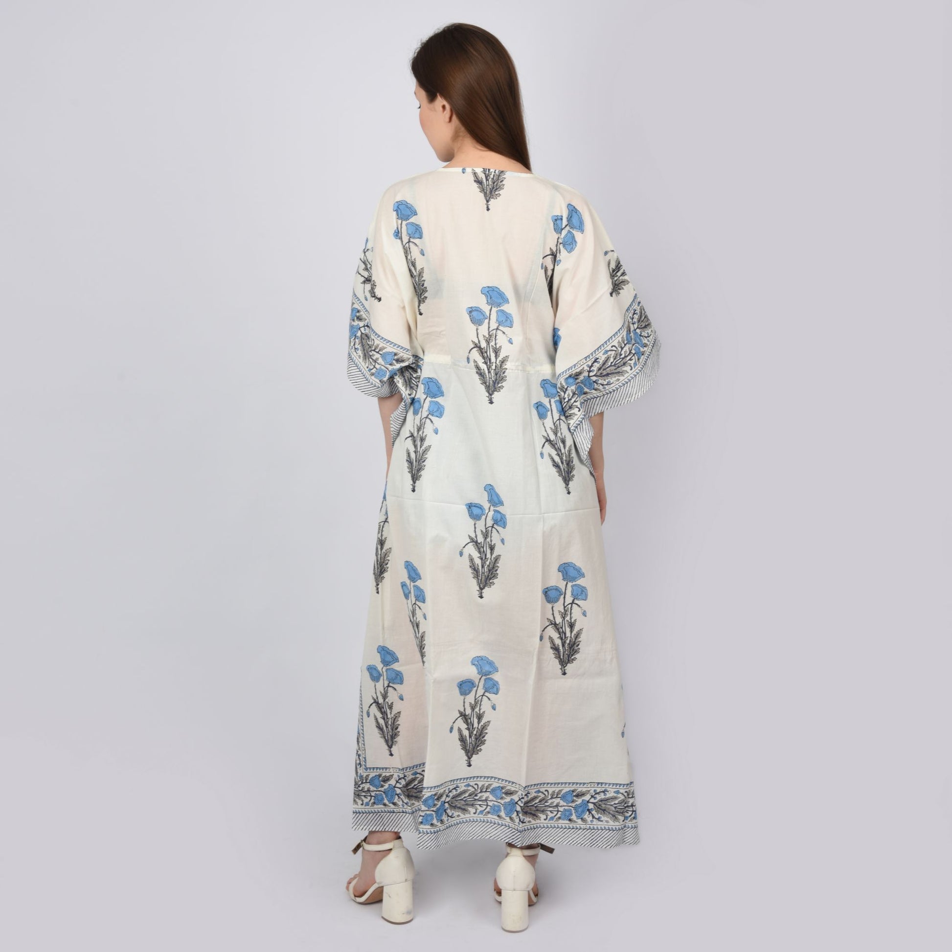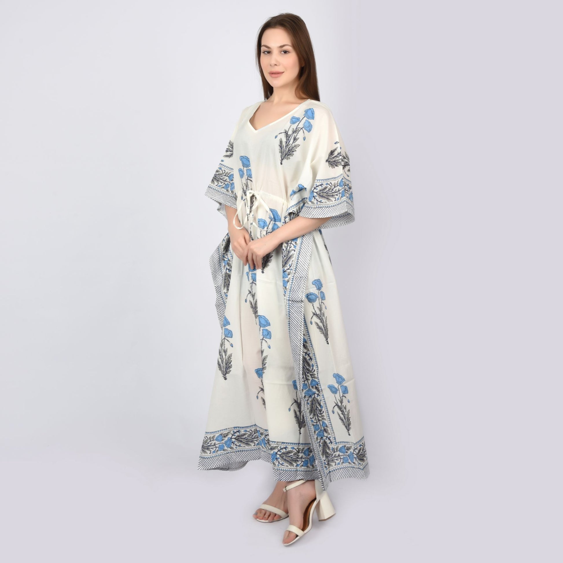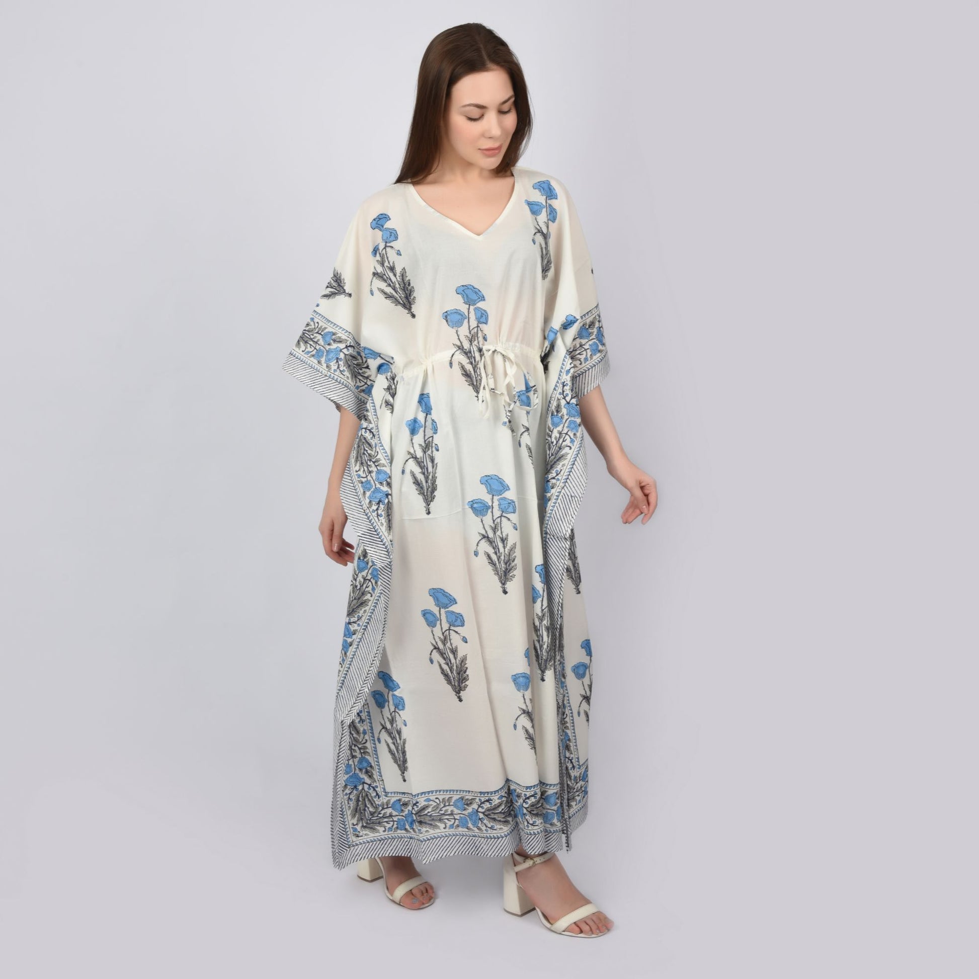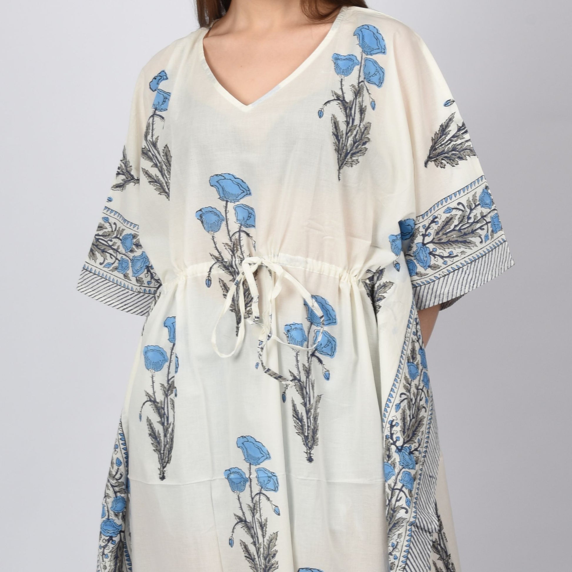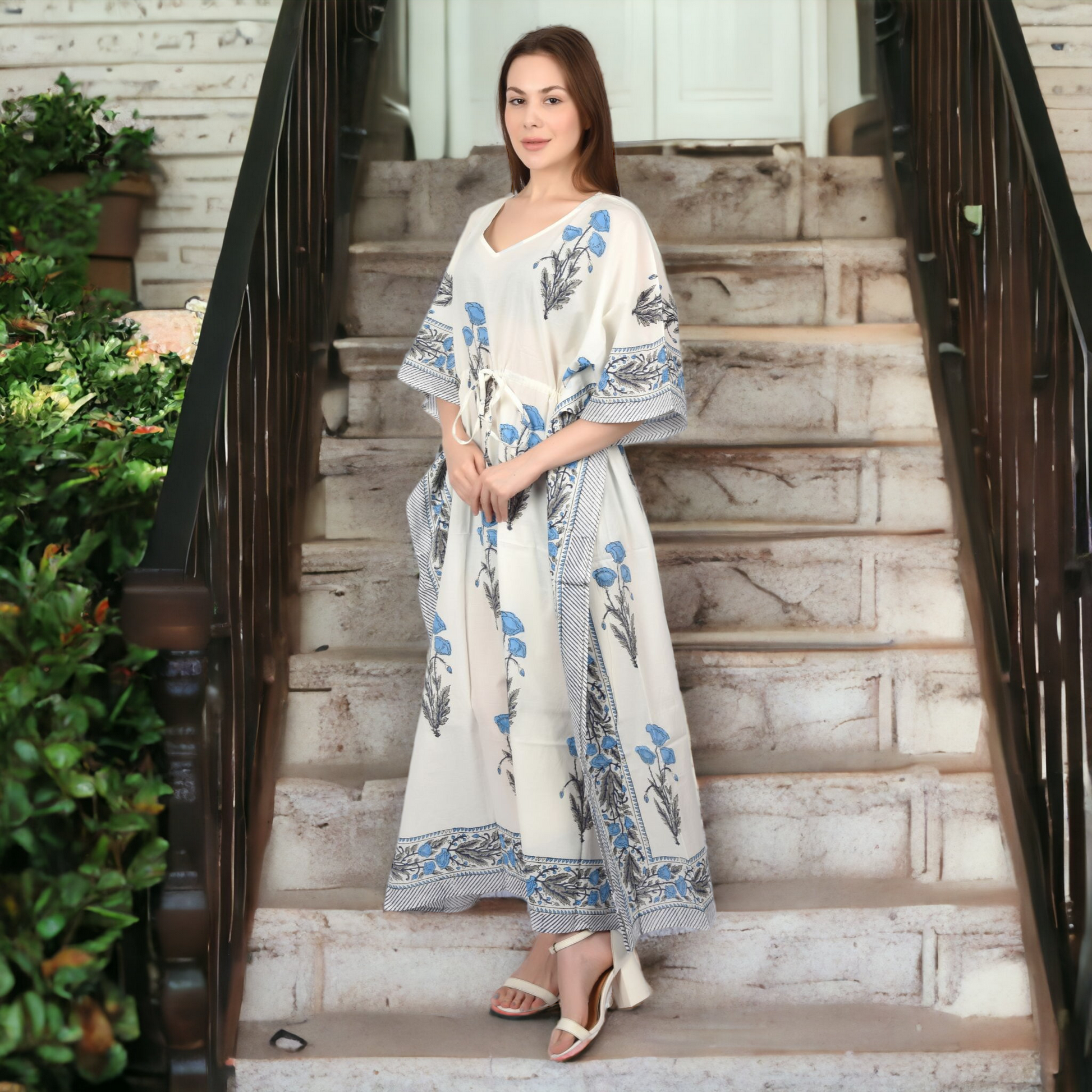 These colorful cotton caftans for women are perfect for warm weather wear. Block printed by hand with vibrant floral motifs, each caftan has a unique aesthetic. Made of breathable cotton fabric, these caftans will keep you cool in the summer heat. The loose silhouette provides an airy and comfortable fit, with three-quarter sleeves allowing free arm movement. Whether you're lounging at home or heading to the beach, these caftans make for effortless style. Machine washable for easy care, they can be paired with sandals or worn as cover-ups over swimsuits. Add a pop of print to your wardrobe with one of these beautiful block printed caftans.